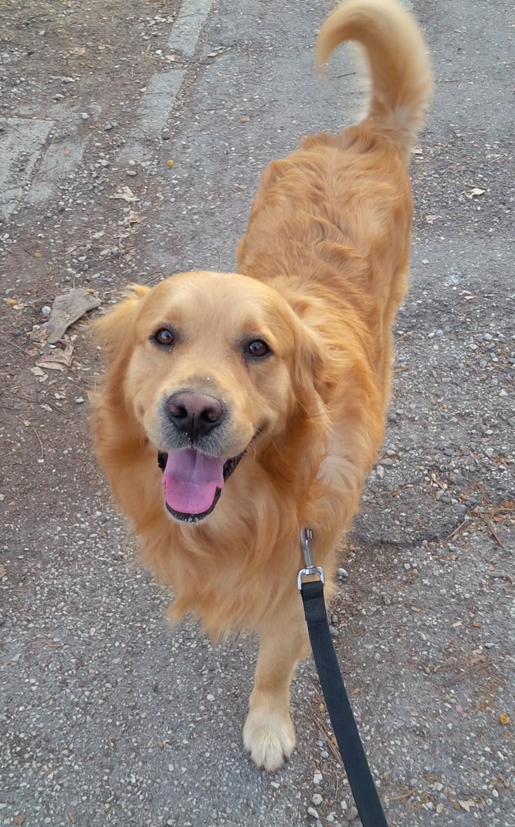 This photograph beautifully captures the radiant charm of a golden retriever during a walk, and every detail of the moment seems to tell a story. The dog, with his golden coat gleaming under the soft natural light, looks absolutely delighted. His fur is thick, wavy, and slightly ruffled, showing that he is both well-groomed and full of life. Golden retrievers are known for their warmth and friendliness, and this image truly encapsulates those qualities.