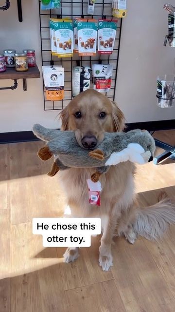 Behind him, the shop shelves are lined with treats, toys, and supplies, but out of everything available, he decided this particular toy was the one. Dogs, especially goldens, often form attachments to certain textures, shapes, or even just the feel of a toy, and it’s clear that this otter tugged at his heart. The way he holds it firmly yet carefully reflects his nurturing side, almost as if he’s adopting the toy rather than just playing with it.