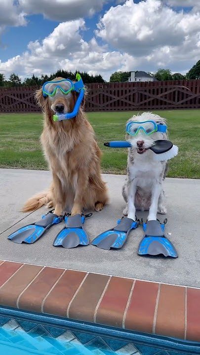This photo captures two adorable dogs dressed up as if they’re ready to dive into the pool for a snorkeling adventure. Both pups are sitting side by side near the pool’s edge, wearing full sets of swim gear—complete with bright blue snorkels, matching flippers, and goggles strapped securely around their heads. The sight is both hilarious and heartwarming, blending the playful imagination of their human owners with the cooperative charm of these furry friends.