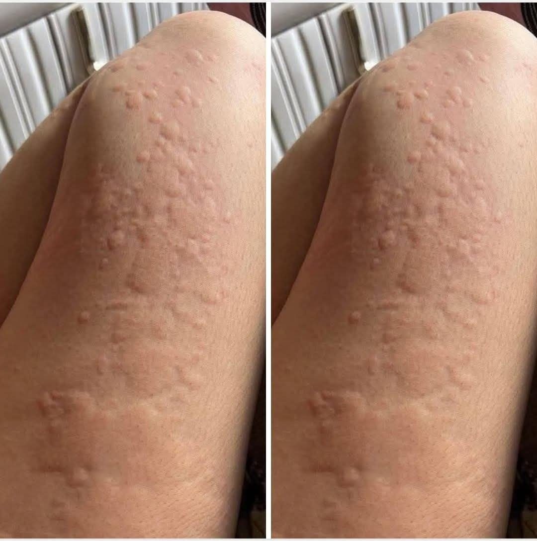 Hives, or urticaria, are itchy, raised welts that can appear pink, red, or flesh-colored. On darker skin, they may look slightly lighter or darker than the surrounding area. Though sometimes painful or stinging, hives are usually caused by allergic reactions to foods, medications, or environmental factors.