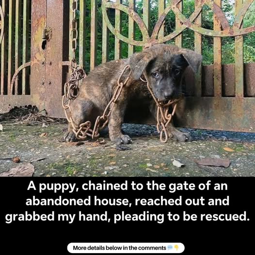 On a quiet, overgrown path, beside a rusted gate of an abandoned house, a heartbreaking sight brought everything to a halt. There, tethered tightly with thick, heavy chains, sat a small, frightened puppy—eyes wide, body trembling, hope fading. The rusty metal links were wrapped cruelly around his frail neck and body, anchoring him to a life of fear, hunger, and neglect. But in that moment, as I knelt beside him, something incredible happened. He reached out his paw and gently grabbed my hand—as if to say, “Please… help me.”