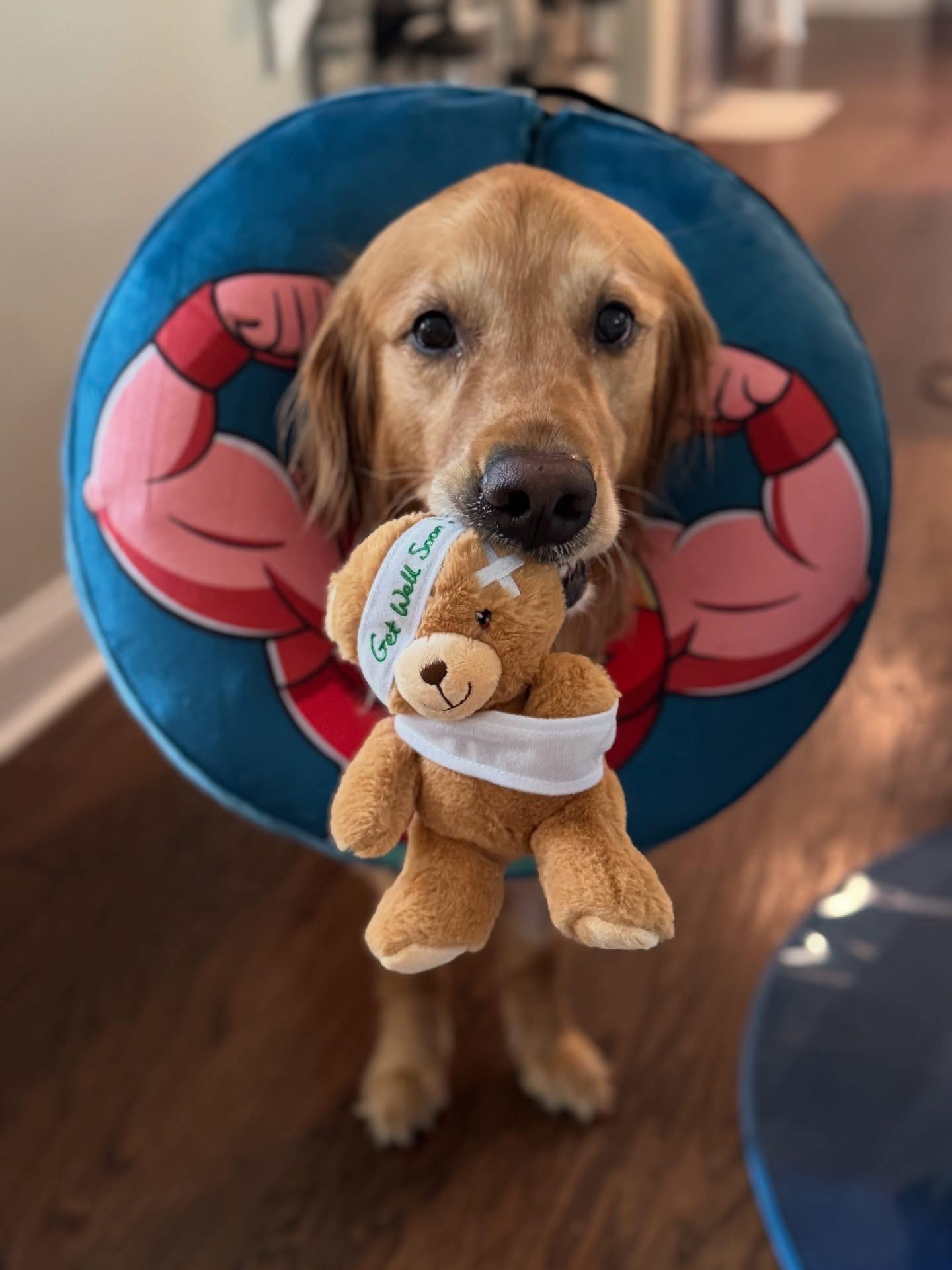 This photo says it all — Teddy, with his “strongman” recovery cone, proudly holding his little “Get Well Soon” bear, reminding us all of his quiet strength and determination. He’s a fighter. He’s our hero. And he’s surrounded by love every step of the way.