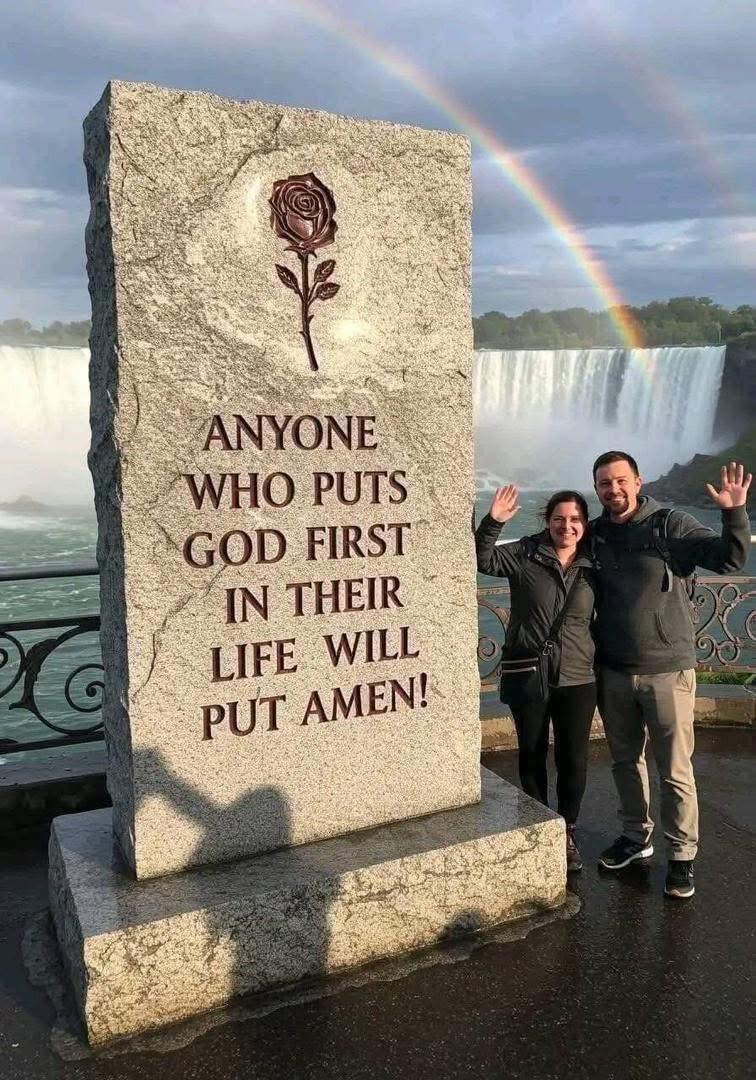 Above the text is a carved rose. The monument is set beside a scenic location — Niagara Falls, visible in the background, with a double rainbow arching gracefully above the misty cascade. The photo captures a hopeful, serene atmosphere with symbolic elements: the powerful falls, the peaceful rainbow, and the religious inscription, all blending together to create a spiritual and uplifting scene.